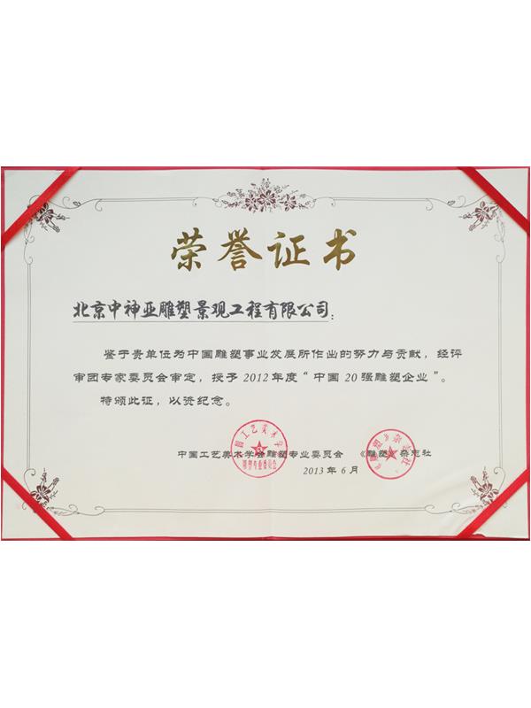 • 2012年度中國20強雕塑企業榮譽證書